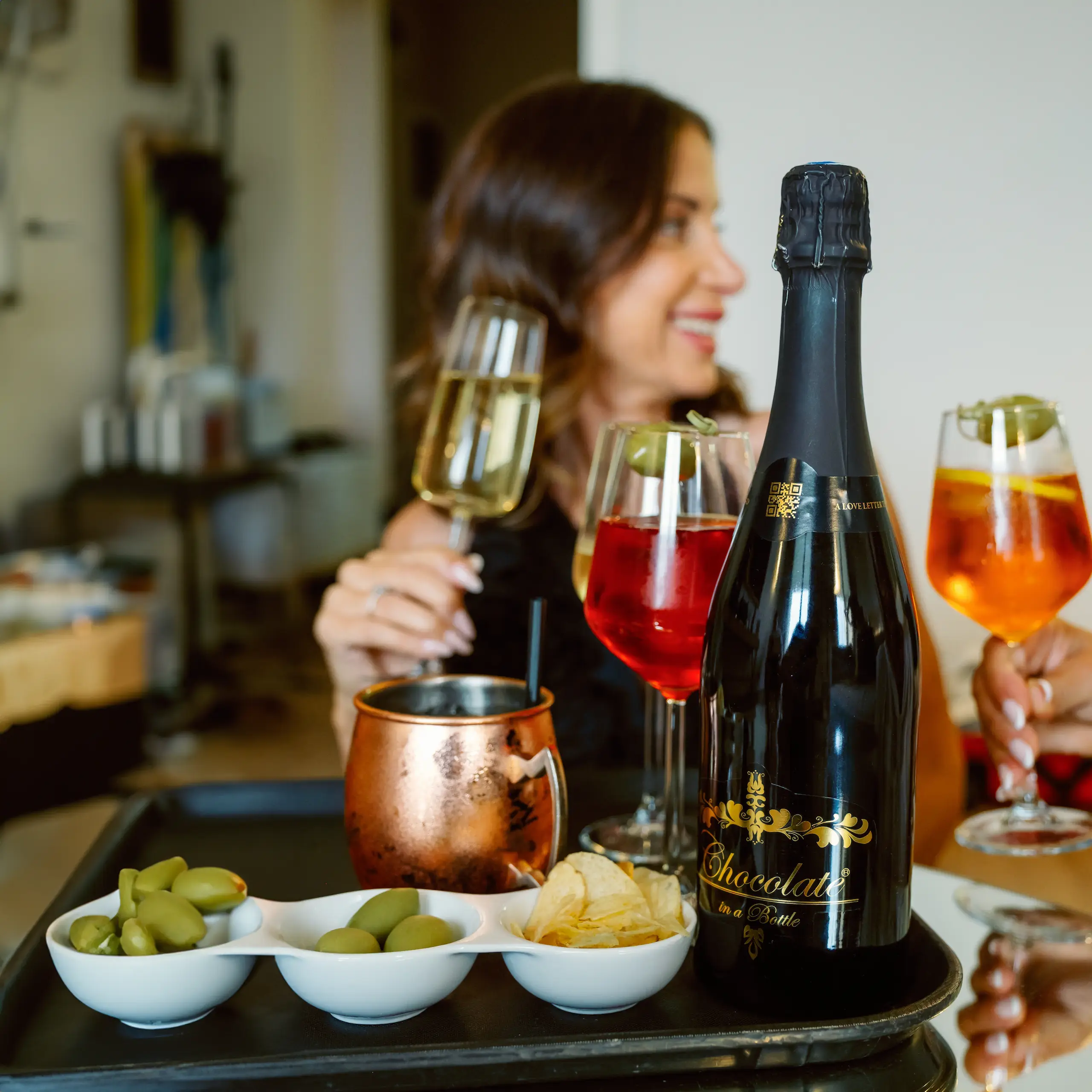 Chocolate in a Bottle est un vin blanc pétillant gourmet du sud de la France, élaboré à partir de raisins Chardonnay et d’extraits de cacao et de noisettes. En bouche, l’arôme délicat des noisettes est renforcé par la touche de chocolat, dû au cacao. Servez cette boisson très fraîche, il est idéal pour accompagner les desserts ou les fruits. Chocolate in a Bottle est exclusif, gourmand et unique.